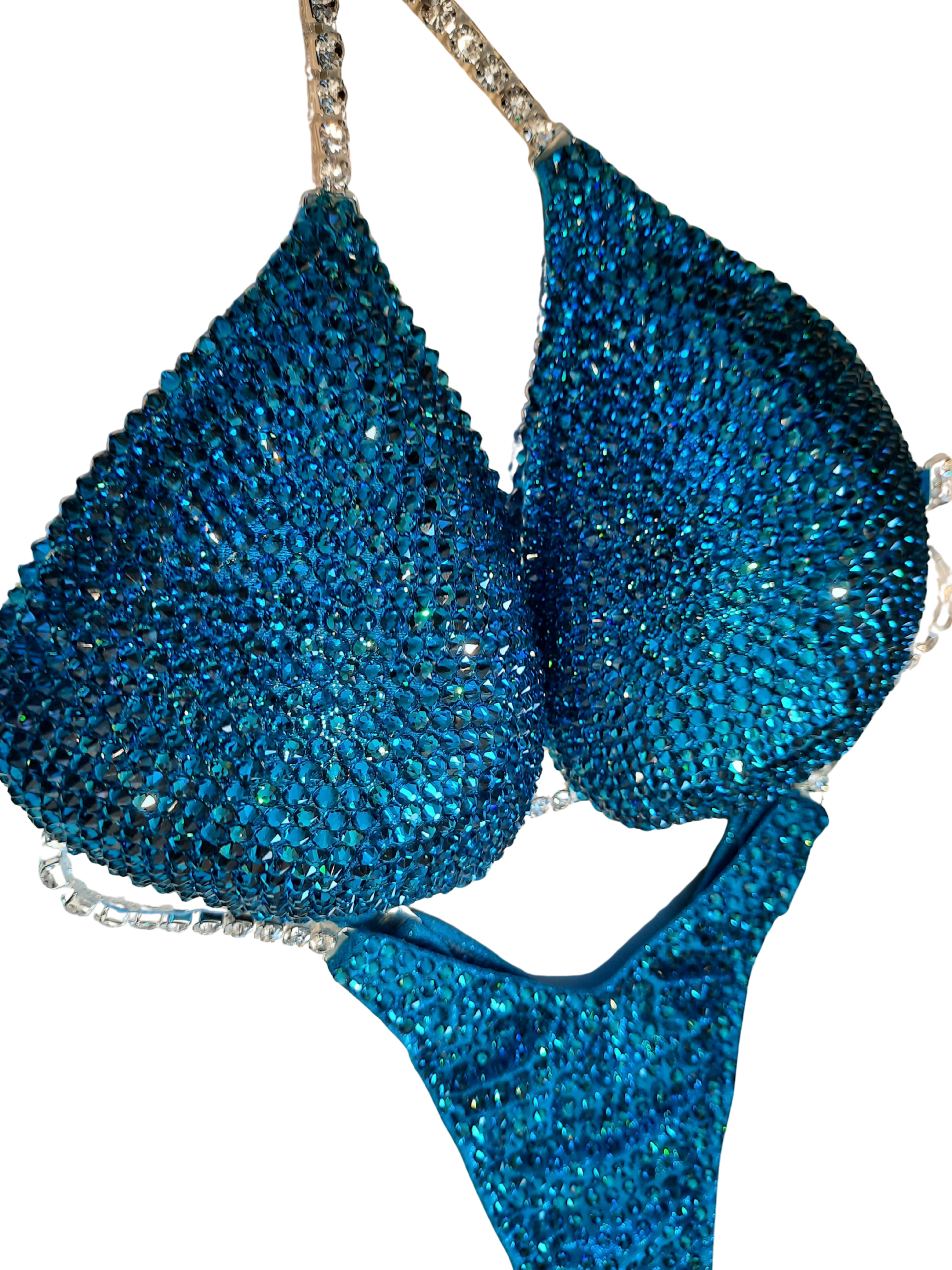 Biquíni em azul oceano, totalmente cravejado de cristais turquesa. Um modelo que destaca cada detalhe do teu físico com luz, glamour e sofisticação em palco.
