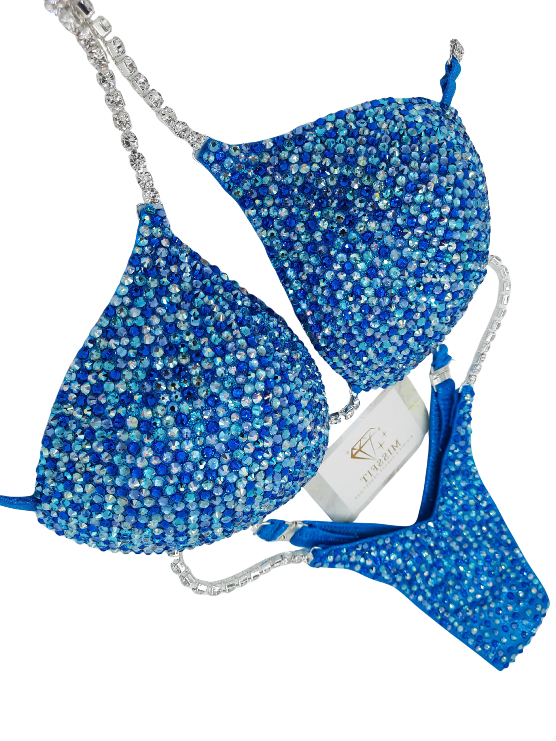 Biquíni em azul oceano, totalmente cravejado de cristais em vários tons de azul. Um modelo que destaca cada detalhe do teu físico com luz, glamour e sofisticação em palco.