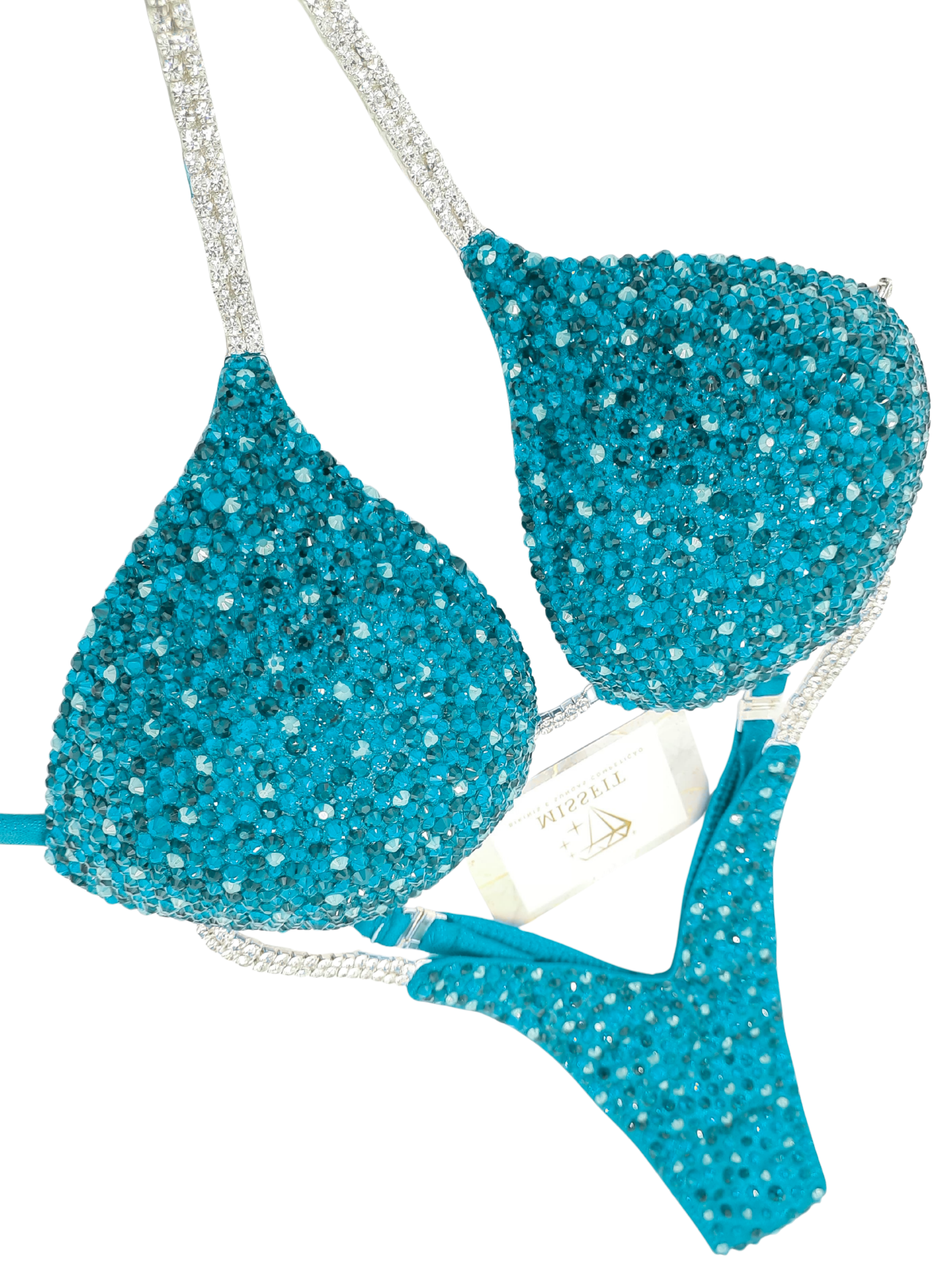 Biquíni azul com pedras brilhantes e alças prateadas — um look vibrante e cheio de energia para brilhar com atitude.