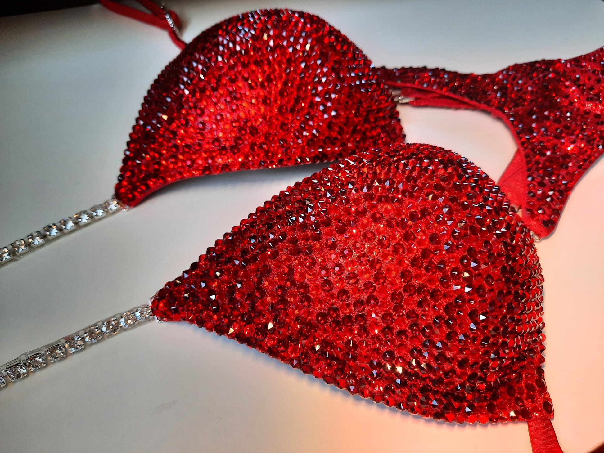 Biquíni em vermelho, totalmente cravejado de cristais vermelhos. Um modelo que destaca cada detalhe do teu físico com luz, glamour e sofisticação em palco.