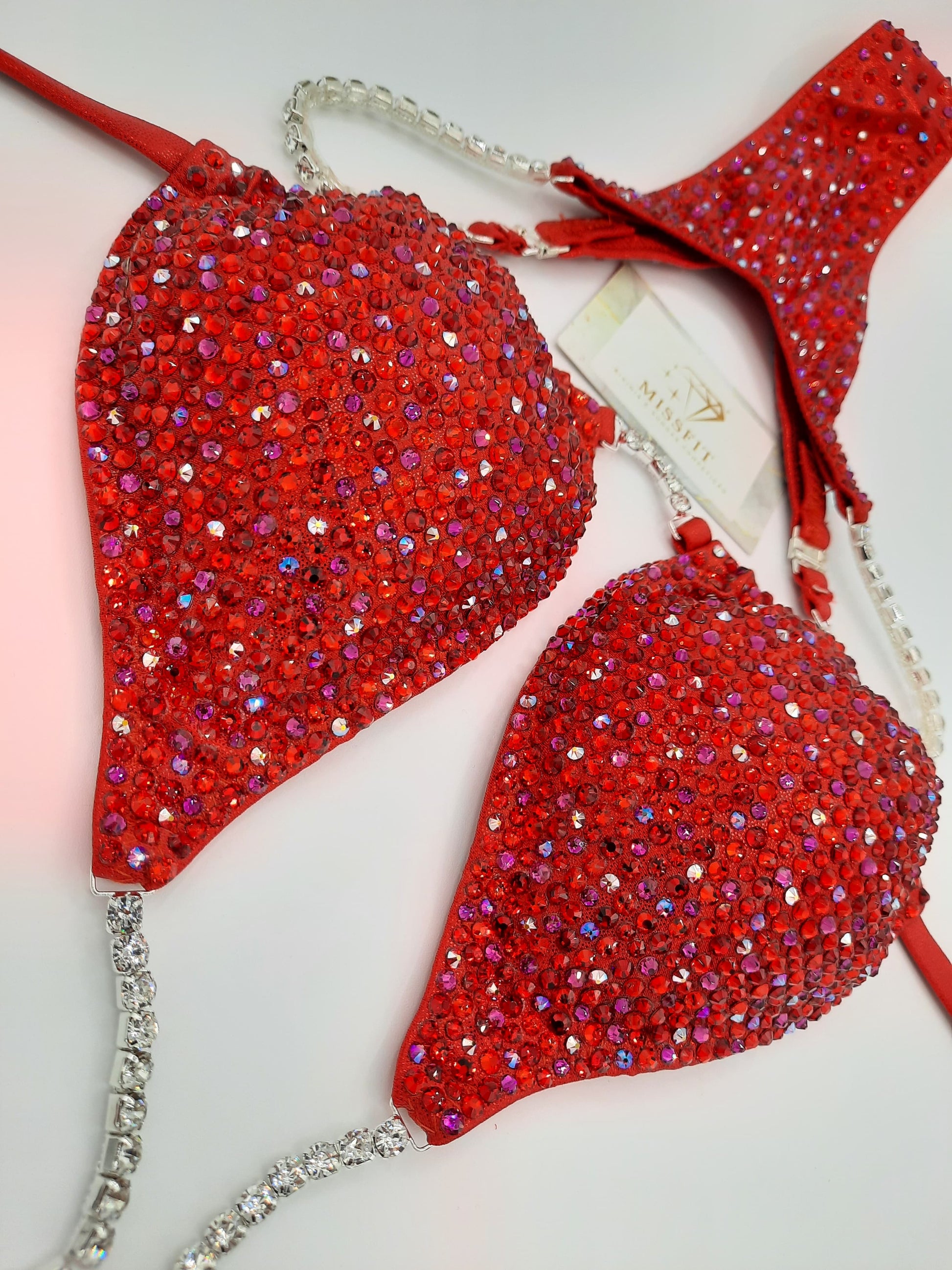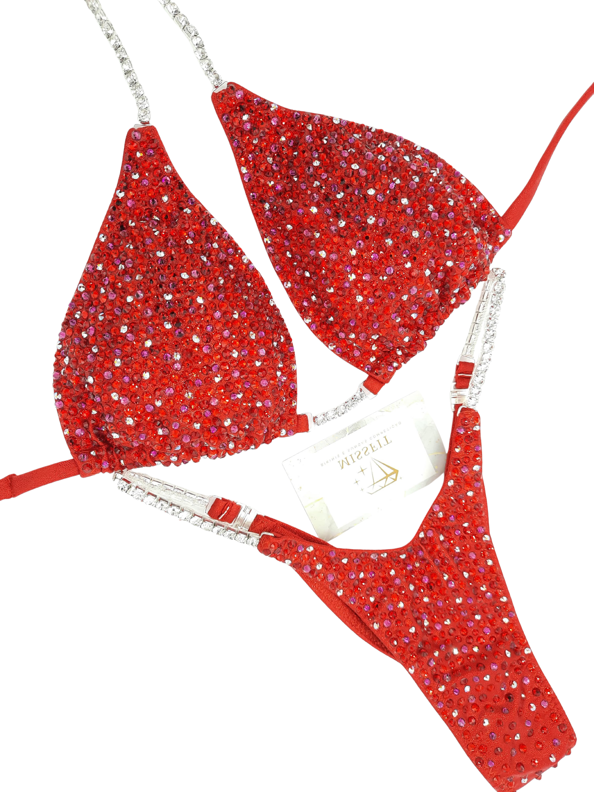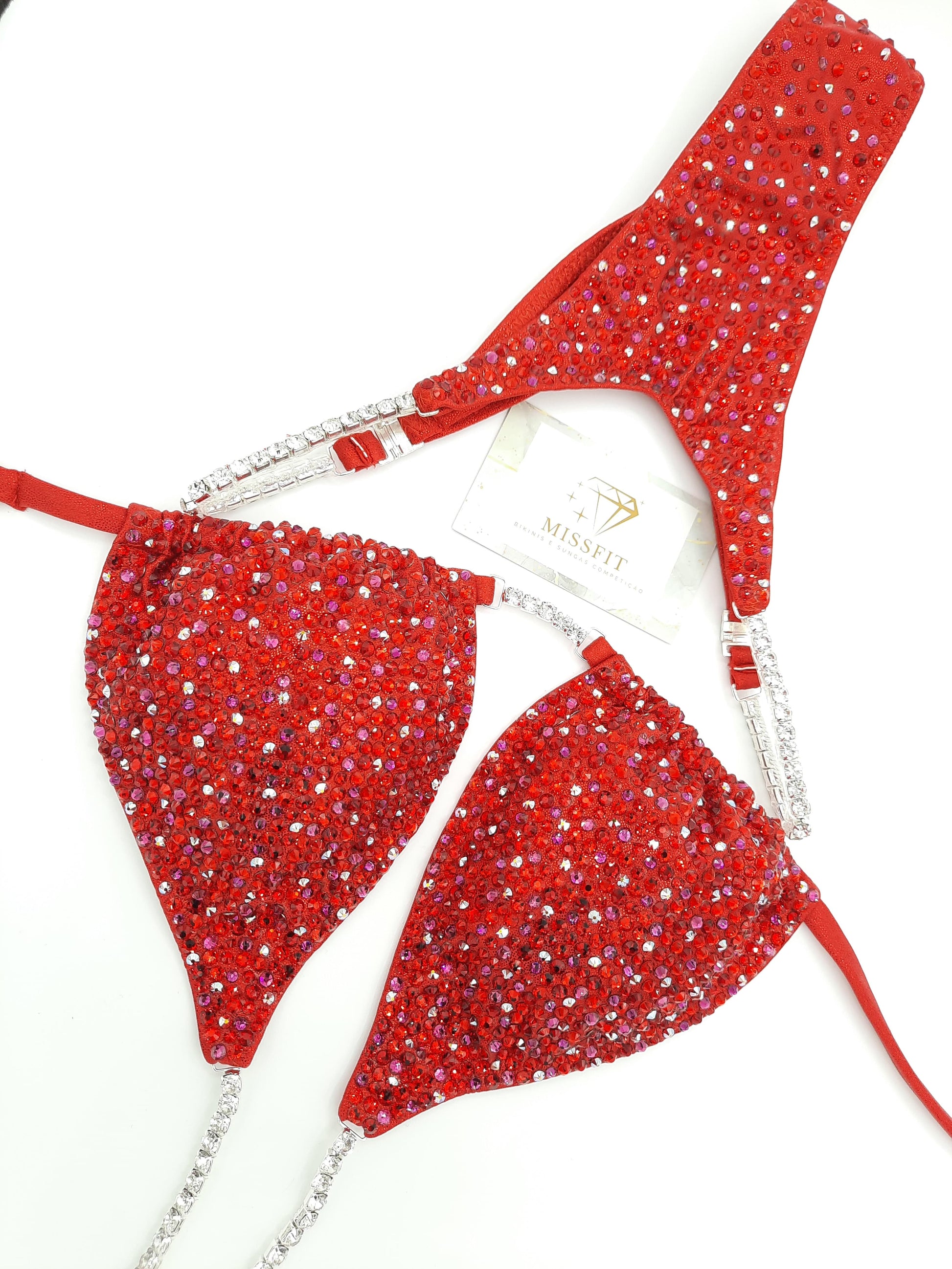 Biquíni em vermelho, cravejado de cristais vermelhos e a contrastar temos aplicados alguns cristais azuis, rosas e brancos Um modelo que destaca cada detalhe do teu físico com luz, glamour e sofisticação em palco.