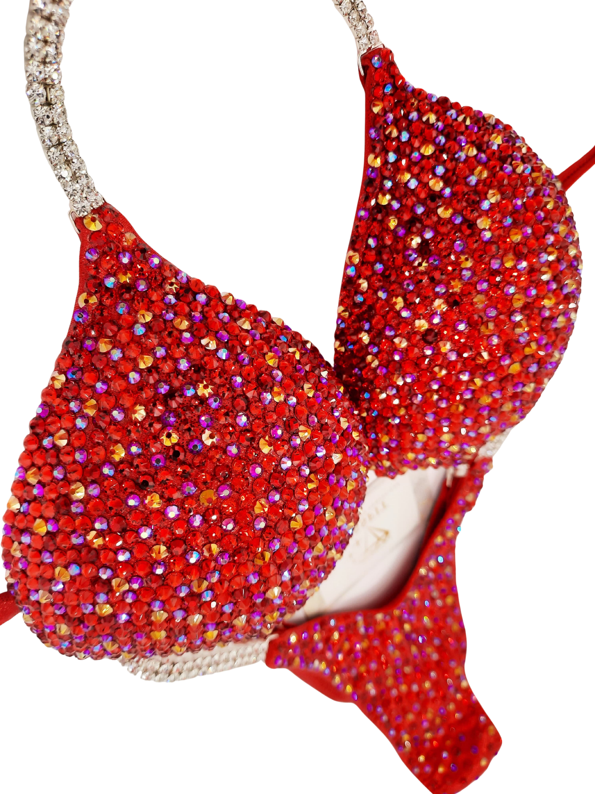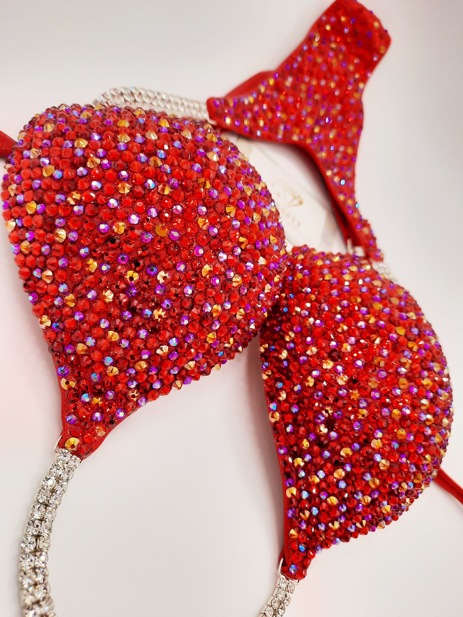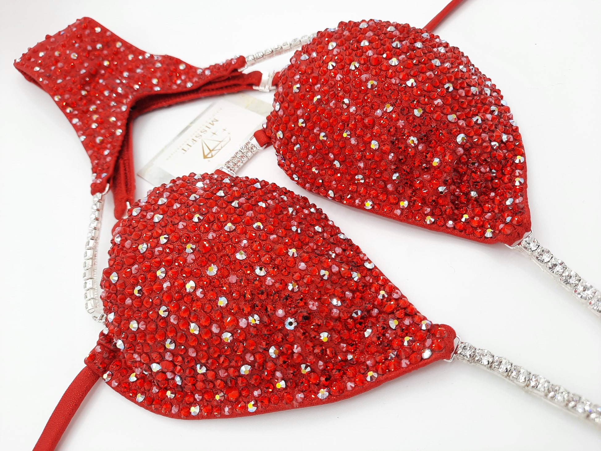 Biquíni em vermelho, cravejado de cristais de varias cores. Um modelo que destaca cada detalhe do teu físico com luz, glamour e sofisticação em palco.