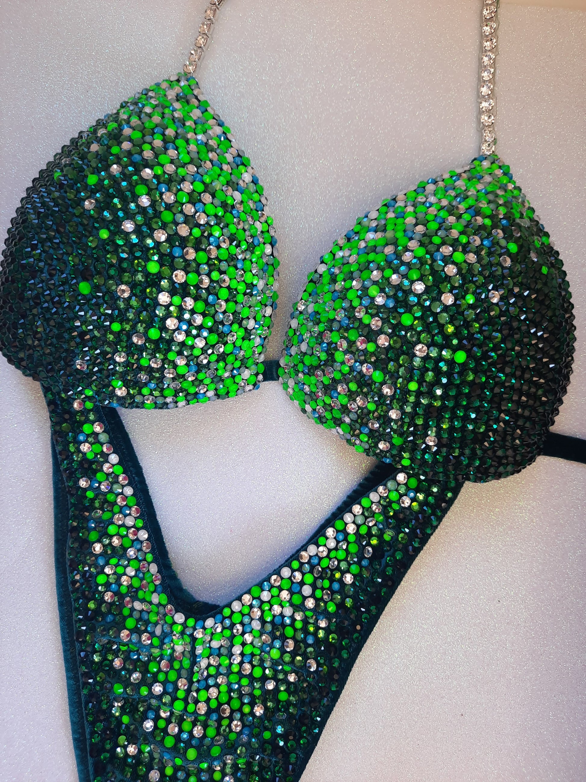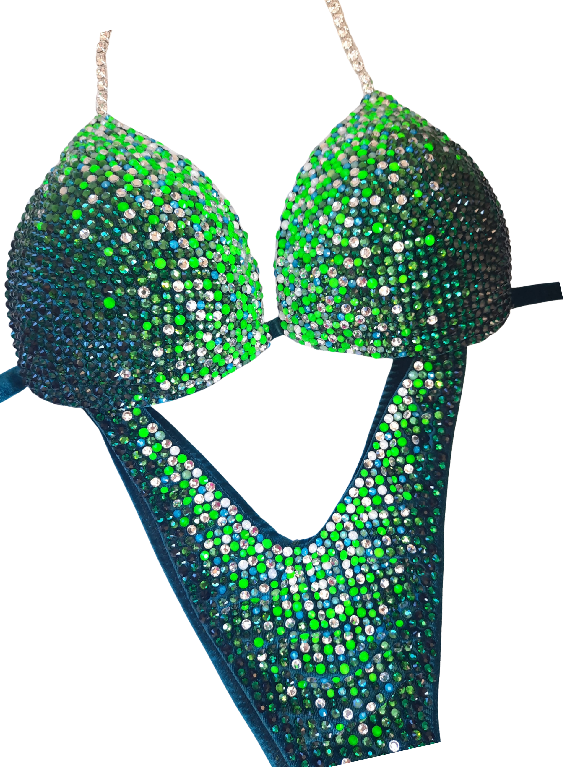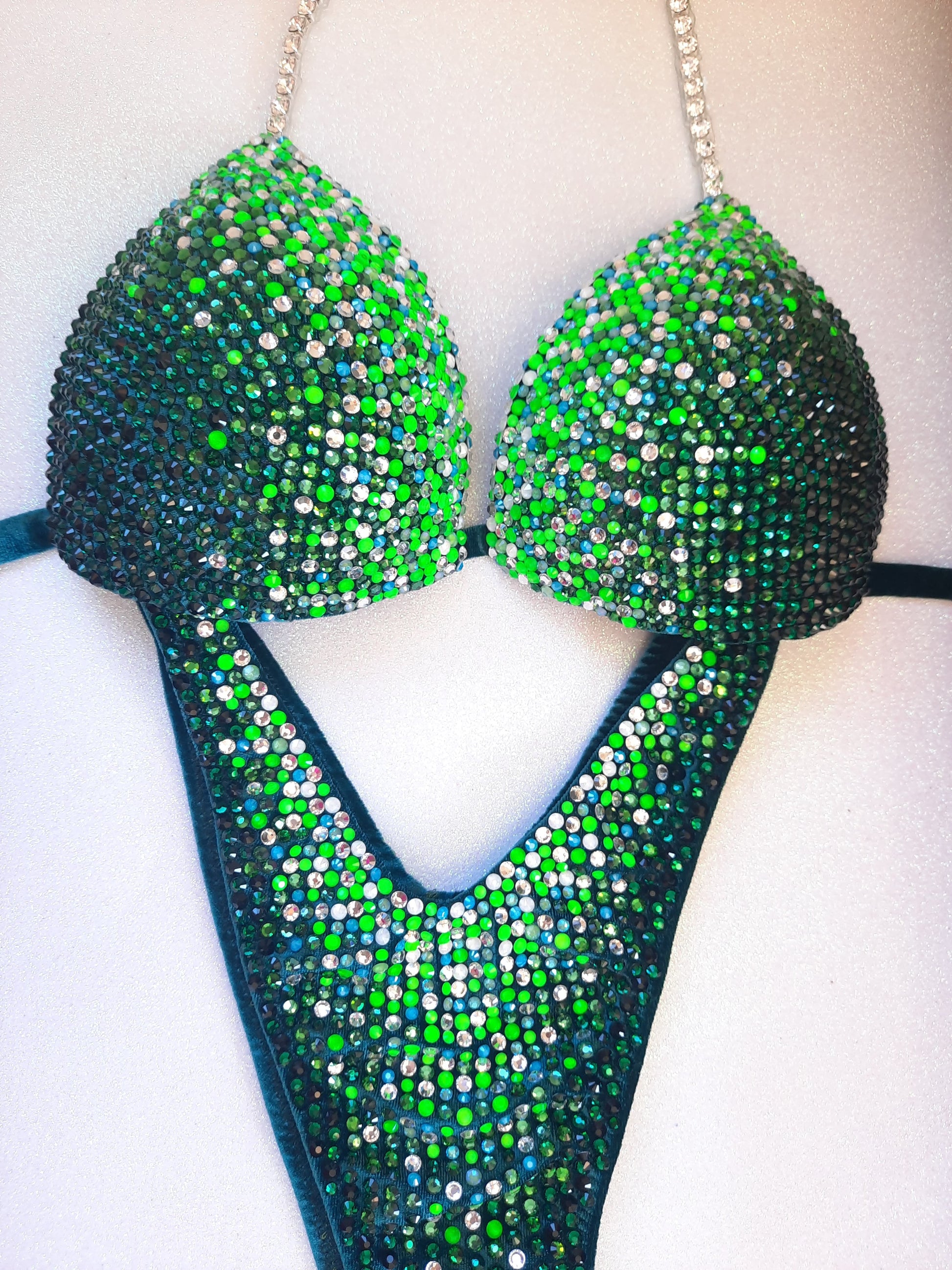 Biquíni de competição em verde esmeralda com cristais intensos em tons neon e prateado. Um modelo ousado e vibrante, ideal para quem quer marcar presença com atitude e brilho em palco.