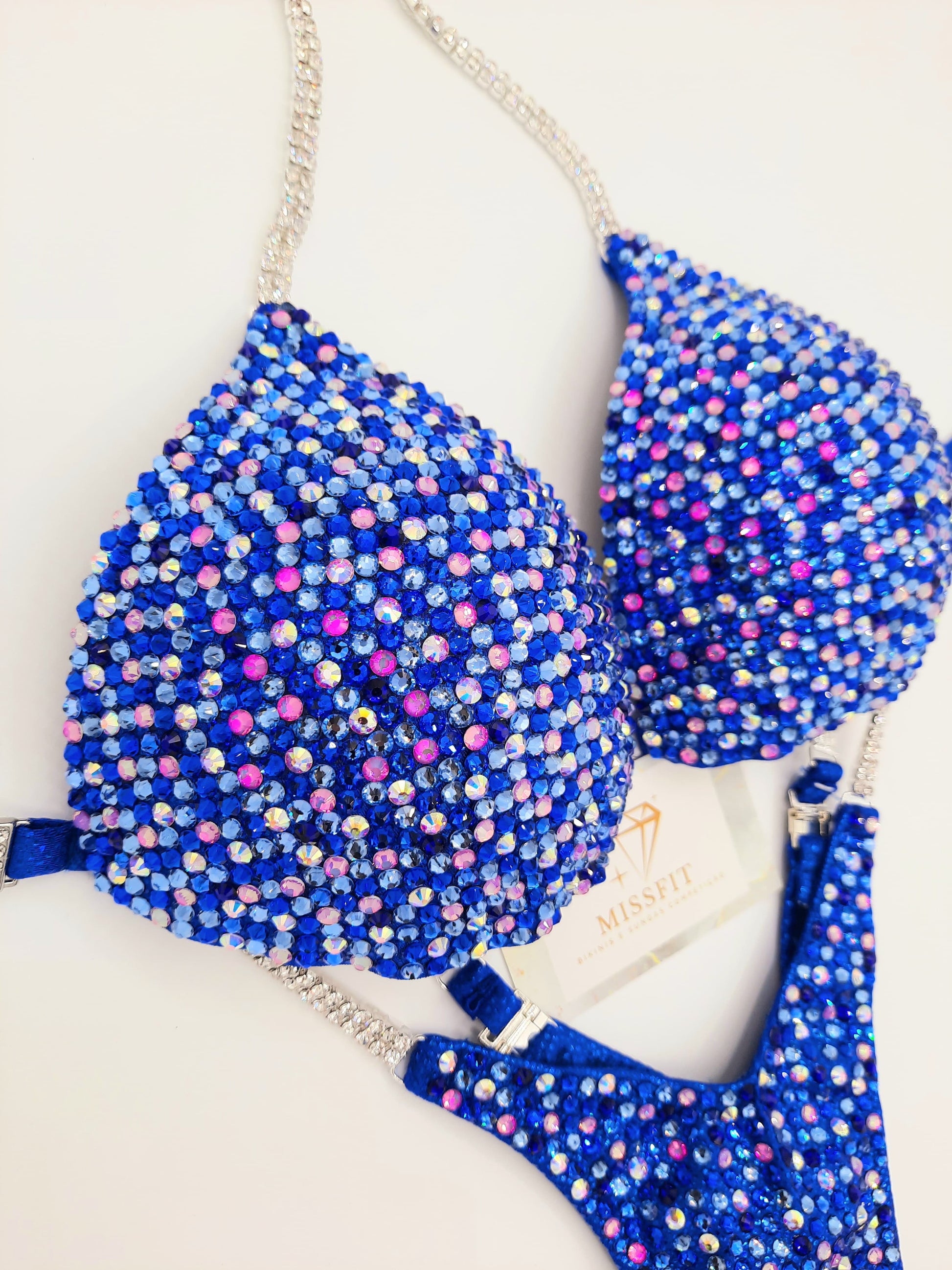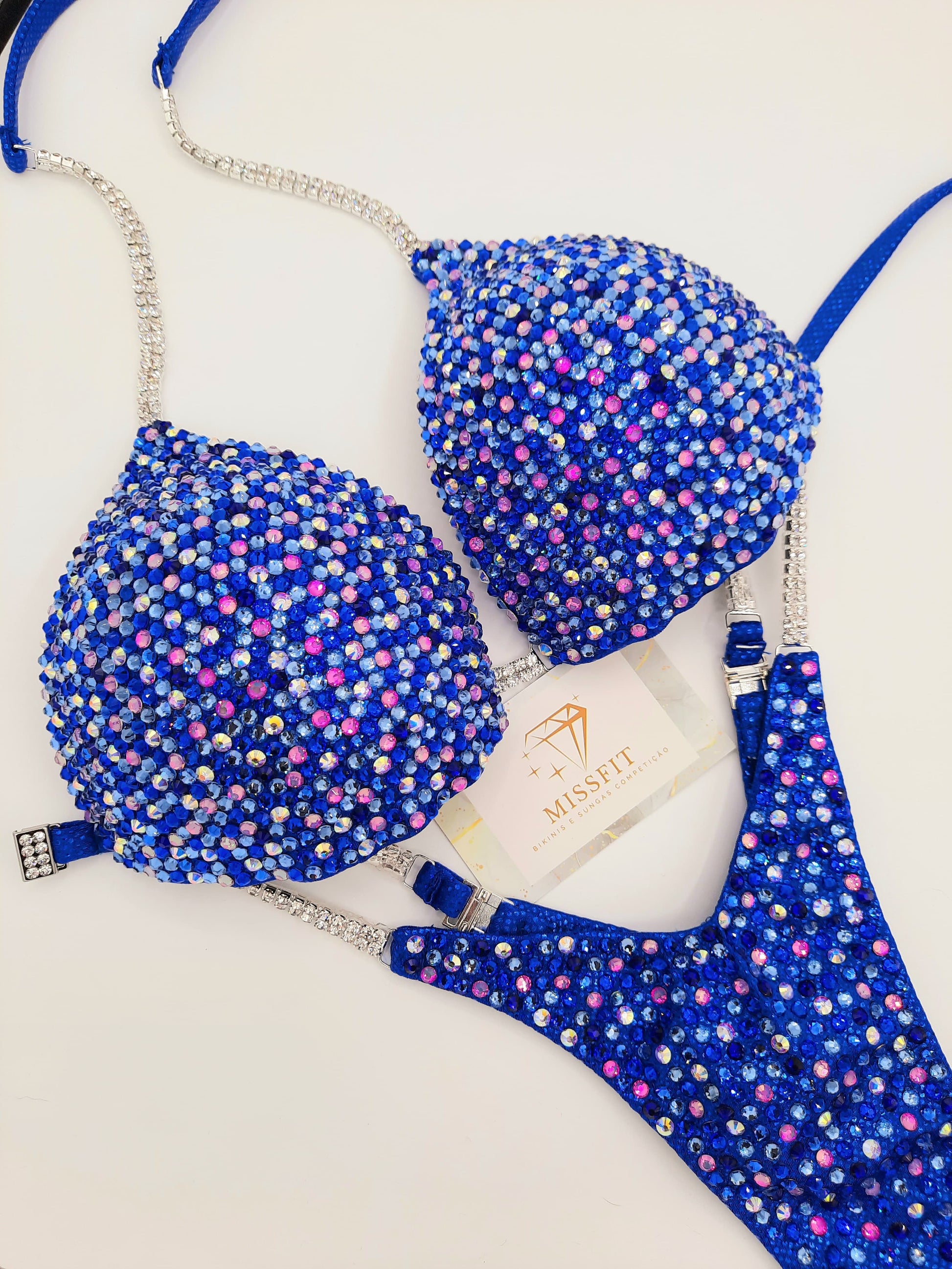 Um biquíni em azul royal, totalmente cravejado de cristais cintilantes em tons de rosa, violeta e prateado. Com acabamentos em correntes de strass, foi criado para destacar a tua forma física com elegância, atitude e muito brilho.