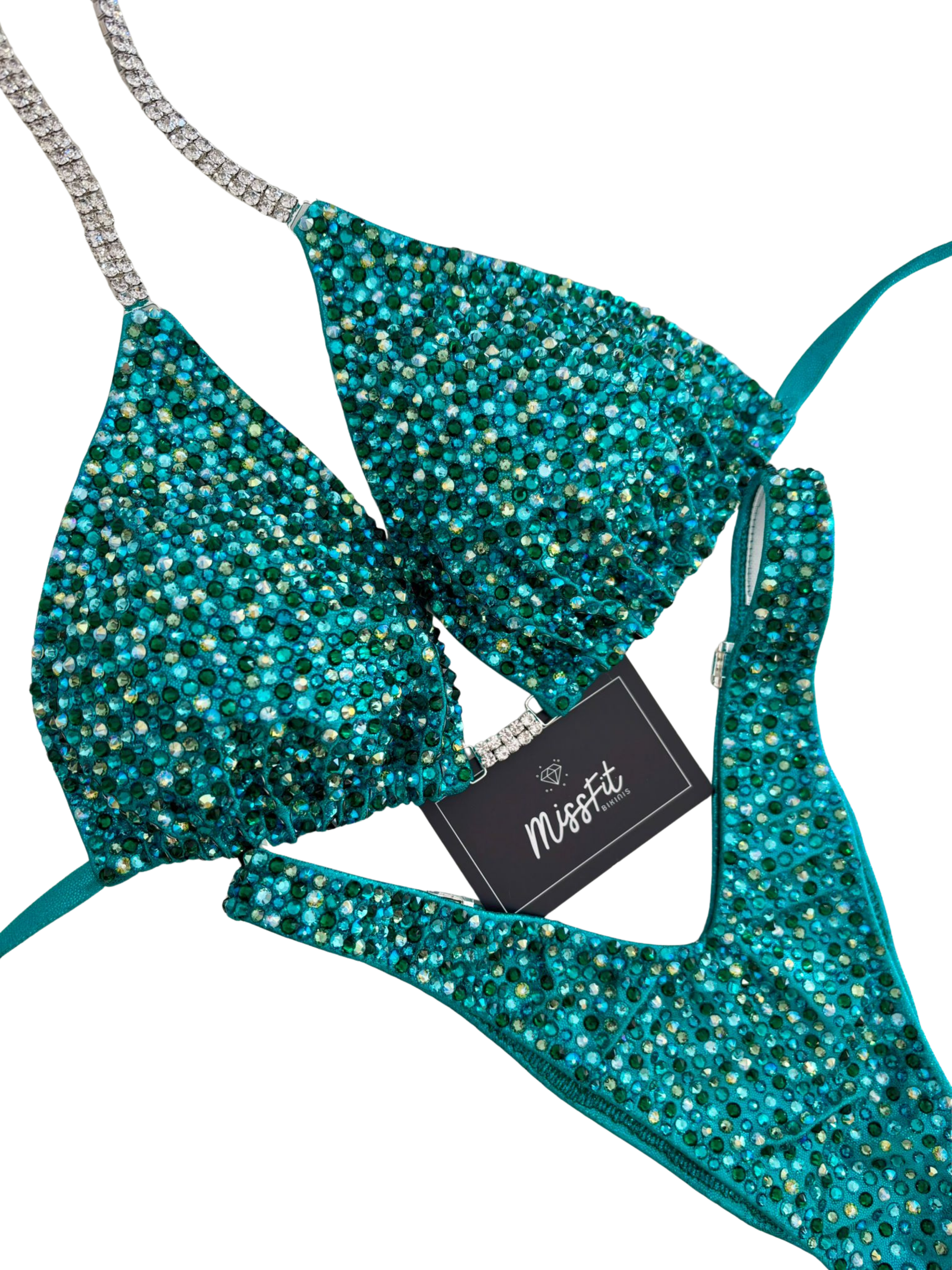 Biquíni verde com lantejoulas verdes e azuis que criam um efeito brilhante e vibrante — ideal para quem quer destacar-se com estilo.