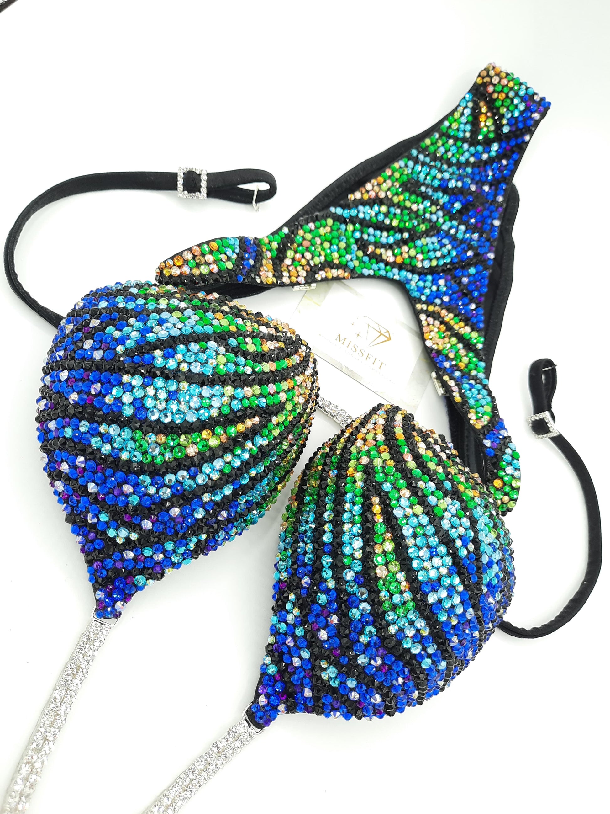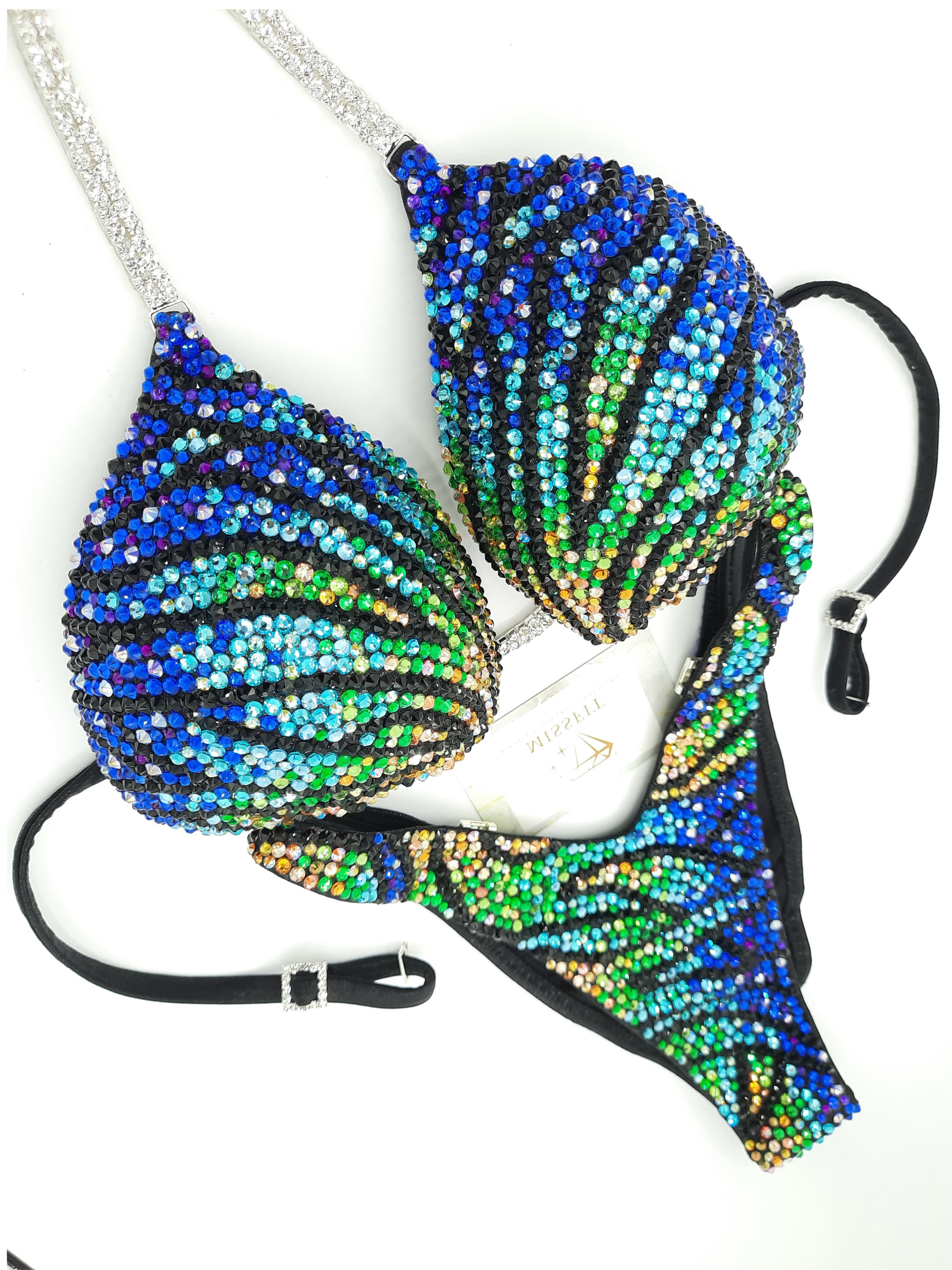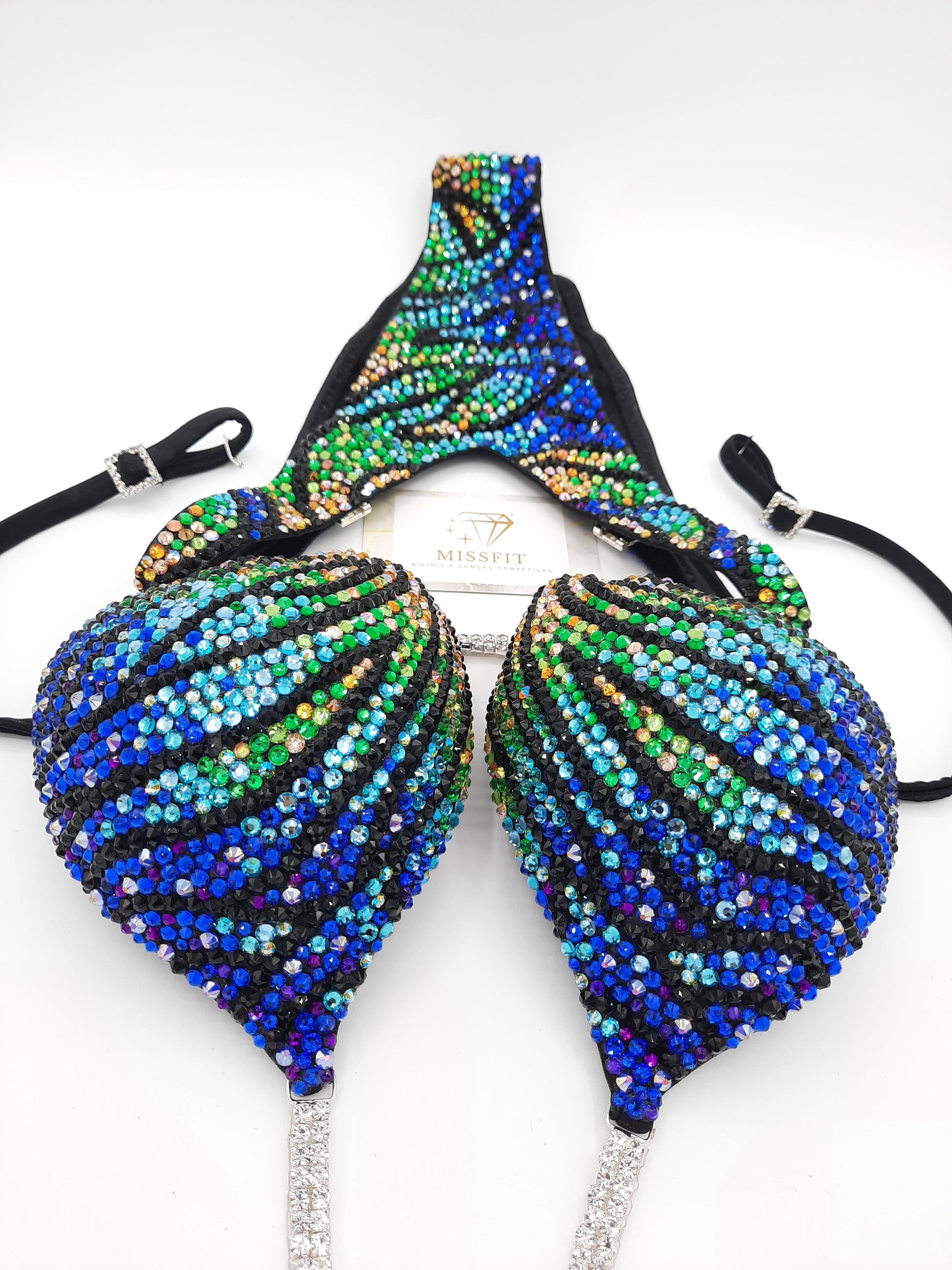 Biquíni de competição azul, preto e amarelo. Um modelo ousado e vibrante, ideal para quem quer marcar presença com atitude e brilho em palco.