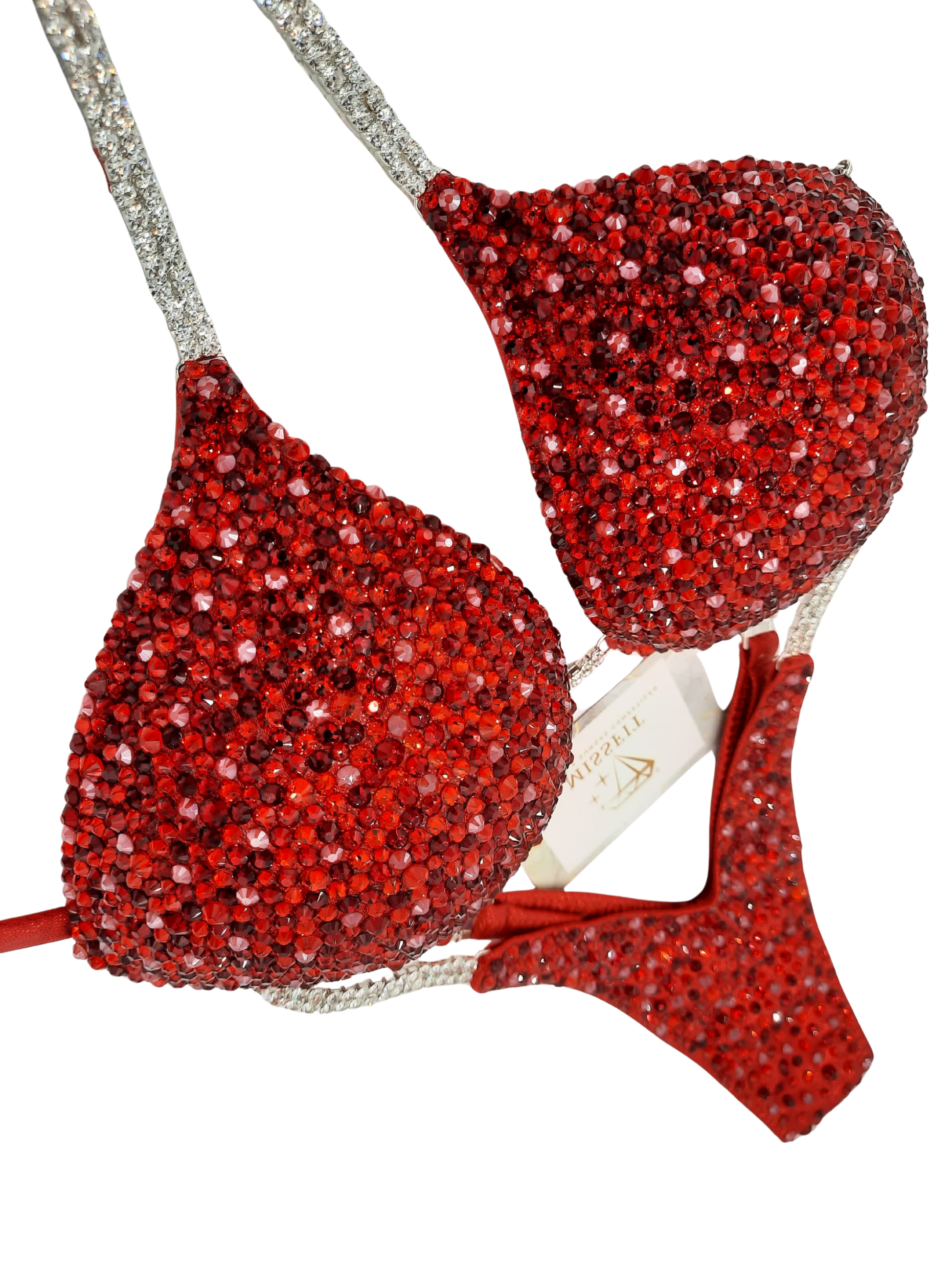Biquíni vermelho sofisticado, com cristais vermelhos em harmonia, destacando-se pelos apontamentos mais intensos no topo da copa e da cueca, suavizados por toques de cristais num vermelho mais esbatido e brilhante, criando um efeito luminoso e elegante.